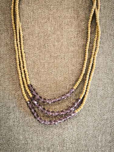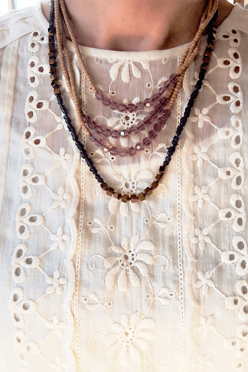 The Jewelry Arch Bundle can be used in several contexts. The colour combination is purple with bronze-beige, camel beads, and lilac bohemian glass beads, which are a perfect match, combined with outfits in these colours: dark grey, eggplant, purple, white, chocolate brown, beige, orange, mustard, and silver grey.