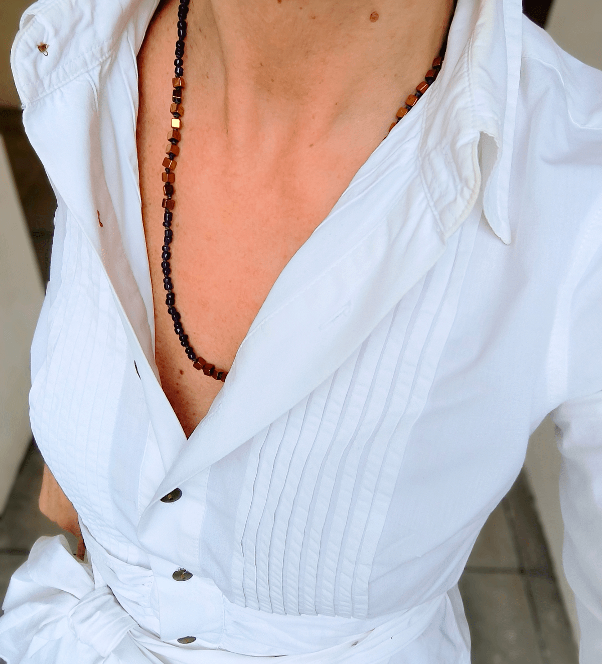 The Jewelry Arch Bundle features the HORIZON Necklace, a line of squares with purple seed beads, combined with the OPERA Necklace. It’s a calm and deliberate combination, and references the meeting point of architecture and the horizon. It’s a Mediterranean, modern, and confident piece.